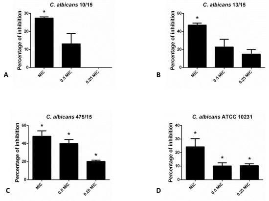 Inhibition of biofilm formation in different C. albicans strains: (A)- C. albicans 10/15; (B)- C. albicans 13/15; (C)- C. albicans 475/15 and (D)- C. albicans ATCC 10231 after application of hesperetin in concentrations 0.25 MIC (0.041 mg/mL), 0.5 MIC (0.082 mg/mL) and MIC (0.165 mg/mL). Mean values of triplicate independent experiments ± SD are shown. * p < 0.05 compared to control.