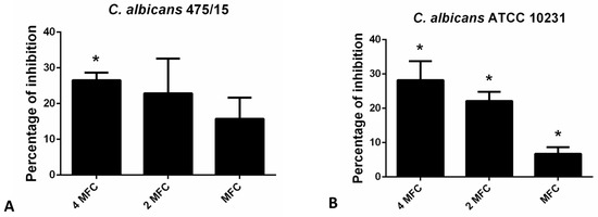 For the eradication of fungal biofilms higher concentration (4 MFC, 2 MFC and MFC) were examined in CV assay (Figure 3). The highest applied concentration (4 MFC) exhibited the strongest biofilm eradicating potential (24 h old biofilms were eradicated for more than 60% in the case of both strains tested).