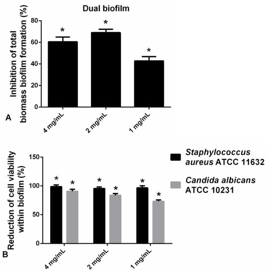 The application of hesperetin (2 mg/mL) against polymicrobial biofilm consisted of C. albicans and S. aureus has significantly reduced biofilm biomass as determined in the CV assay (Figure 6A). Additionally, in the case of the S. aureus-C. albicans mixed biofilm, the viable cells of both microorganisms were found to be reduced for more than 90% at all tested concentrations, as determined in the CFU assay (Figure 6B). Significant reduction in the viable cells of S. aureus and C. albicans was observed when compared to the control (Figure 6B).