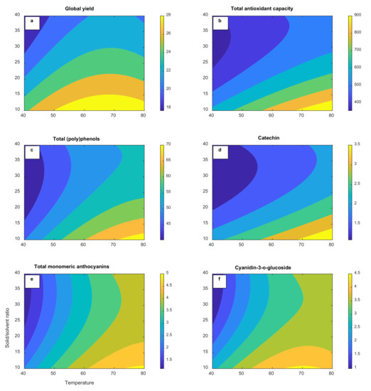 The RSM model was used to generate 3D and contour response surface plots in order to graphically represent the relationship between independent (temperature and solvent-to-solid ratio) and dependent variables (global yield, total antioxidant capacity, total (poly)phenols, catechin, total monomeric anthocyanins, and cyanidin-3-