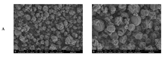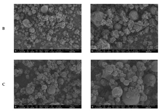 Figure 2. The dried particles exhibited spherical structures with some dents and wrinkles on their surfaces. Either rapid evaporation of water within the particles due to the high inlet temperature or the slow water diffusion rate due to the low inlet temperature cause particle shrinkage during spray drying [