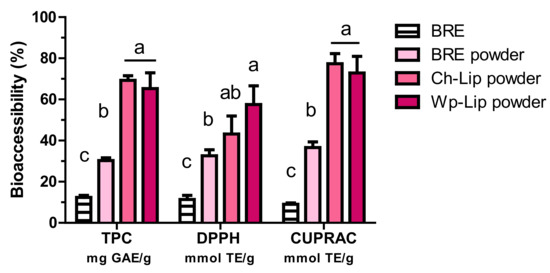 Figure 3). The total antioxidant capacity in the bioaccessible fraction followed the same trend as the total (poly)phenols for spray-dried BRE, demonstrating an approximate 2.9- and 4.1-fold increase in the radical scavenging activity and cupric ion reducing antioxidant capacity, respectively. Similarly, chitosan- and whey protein-coated liposomal powders had 3.8- and 8.6-fold higher radical scavenging activity and 5.0- and 8.1-fold higher cupric ion reducing antioxidant capacity compared to the nonencapsulated extract after in vitro digestion. These results suggest that the encapsulation process and biopolymer coating greatly enhanced the amount of phenolic and antioxidant activity in the bioaccessible fraction (