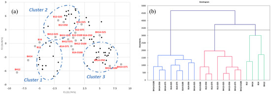 During the oxidation process, various complex reactions produce different degradation products. The results show that as the degree of oxidation increases, peanut oil has a complex composition and total amount of volatiles. Since volatile generation by oxidation changes peanut oil, a principal components analysis (PCA) was used to identify clusters of aroma properties. Three main clusters were identified (Figure 1a). Cluster 1 contained those associated with the aroma from the roasting process including hexanal (green), 2-furanmethanol, 2-acetylfuran, maltol (caramellic), 1-octen-3-one, 1-octen-3-ol (earthy), benzaldehyde (almond), benzenemethanol (floral), 2-octenal, and nonanal (fatty). Cluster 2 contained those generated by the thermal oxidative degradation of volatiles and the oxidized volatiles themselves [36,37,38]. We observed the formation of phenolic derivatives (such as benzene and phenol) via the thermal degradation of lignin and benzaldehyde derivatives via phenylalanine. Cluster 3 contained oxidation volatiles participating in the Mildner reaction (such as 2-methoxy-4-vinylphenol, 2-hexylfuran, and 3-butyl-2,5-dimethylpyrazine). Previous studies have shown that advanced lipid oxidation end products are formed by non-enzymatic reactions between lipid aldehydes and amino phospholipids [39,40]. Therefore, lipid autoxidation and the Maillard reaction should not be considered as two independent reaction pathways but as a single complex interaction [37,38,40]. During agglomerative hierarchical clustering (AHC) analysis, an interesting phenomenon in peanut oil oxidation can be observed: the oxidation volatiles formed depends on the substrate and temperature differences (Figure 1b).