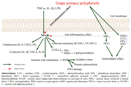 Grape pomace polyphenols research studies have grown in the last decades, given their potential benefic effects on promoting human health. Some of their benefic actions are observed in oxidative stress and inflammation aiming at homeostasis restoration. Regarding the antioxidant effect, polyphenols can modulate the endogenous pathway responsible for combating oxidative stress. These effects can be achieved by polyphenols capacity to activate the nuclear factor E2 and to up-regulate superoxide dismutase, catalase, glutathione, glutathione peroxidase, and heme-oxidase 1 [81,82] or their capacity to scavenge and chelate reactive oxygen species involved in ROS production [83] (Figure 3). In inflammation, polyphenols are reported to inhibit the mitogen-activated kinase pathway, Nf-kB, anddown-regulate cytokines and chemokines [81,82]. Polyphenols also inhibit cyclooxygenase and lipoxygenase, which are involved in the arachidonic acid signaling pathway, being responsible for synthesizing prostaglandin, thromboxane A2, and leukotrienes which further increase inflammatory response [73,74,82] (Figure 3).