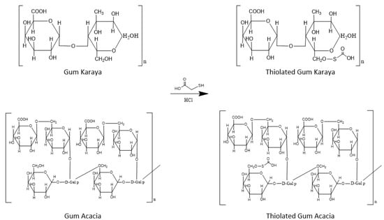 - Bahulkar, S.S.; Munot, N.M.; Surwase, S.S. Synthesis, characterization of thiolated karaya gum and evaluation of effect of pH on its mucoadhesive and sustained release properties. Carbohydr. Polym. 2015, 130, 183–190. [Google Scholar] [CrossRef] [PubMed]
