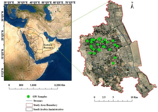 The area of this study is located along the western coastline of the Arabian Gulf in Saudi Arabia’s Eastern Province, within the administrative boundaries of the Al-Qatif governorate (Figure 1). Al-Qatif is a coastal city and oasis with a population of around 524,000 people, and it is bordered to the south by Dammam city and to the north by Al-Jubail. It is characterized by a flat coastal plain with surface elevations increasing westward to a summit of around 12 m. Al-Qatif city is made up of urban and cropland areas; however, in recent years, urban development has significantly replaced croplands. The water in Al Qatif city for irrigation purposes is mainly extracted from shallow and deep aquifers, with more extraction from the deep aquifers due to salinization of the shallow ones [27]. More than 70 hand-dug wells and 1200 artesian wells supply water for the agriculture area [27]. Shallow and deep aquifers have maximum depths of up to 12 m and 130 m below the ground surface, respectively. The shallow aquifers’ water levels range from less than a meter to 2 m and for the deep aquifers the depth of water ranges from 3 to 11 m.