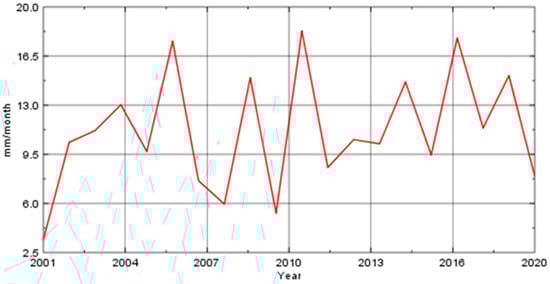 Land use/cover of the Al-Qatif area was evaluated based on a Sentinel image with a 10 m resolution, which was then compared with information from site investigations and aerial photographs. The residential area covers 48.7% of the watershed and is mainly concentrated in the coastal zone. Road’s cover 20.2% of the watershed, while trees and crops cover 14.7% and 6.9%, respectively. Bare land covers 9.4% of the watershed (Figure 2). Figure 3 depicts the monthly average precipitation from 2001 to 2021, estimated by the IMERG final data with 30 min temporal and 0.1° spatial resolutions. This indicates that Al Qatif received 3.42 mm/month in 2001, the lowest amount during this period, and 18.28 mm/month in 2011 [28].