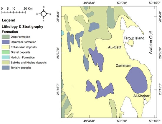 The surface geology of the study area is composed of seven formations, as illustrated in Figure 4. The Dammam Formation is mainly marl, limestone, and dolomitic limestone. The Alat Member of the Dammam Formation forms the upper part and is composed of dolomitic limestone. The Al-Khobar Member of the Dammam Formation is mainly karstified fractured limestone and forms the Al-Khobar aquifer. The other three members of the Dammam Formation are marl and shale and form an aquitard [29]. The Hadrukh Formation consists mainly of interbedded sandstone and shale layers. The Dam Formation is mainly interbedded limestone, marine marl, and clay. Eolian deposits cover most of the surface geology of Al-Qatif, Dammam, and Al-Khobar cities. Interdune sabkha deposits are exposed north and northwest of Al-Qatif city (study area).