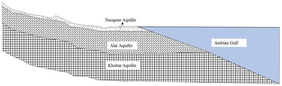 The principal aquifers in the study area are termed the Neogene, Alat, and Al-Khobar aquifers. The Neogene aquifer is shallow, with a maximum depth of 12 m [27] (Figure 5). The Alat and Al-Khobar aquifers, which are part of the Dammam Formation, form the principal aquifers in Al-Qatif and other coastal cities in the studied region. The Alat aquifer, as reported by [30], is present within the uppermost part of the Alat Member of the Dammam Formation, and its lithology is mainly porous dolomitic limestone with an average thickness of 25 m in the coastal area. The Alat aquifer has a maximum depth of 40 m below ground surface and is mainly utilized in the northern part of the Al-Qatif oasis [27]. The Alat aquifer displays a varied range of hydraulic properties, with transmissivity ranging from 2.6 × 10−5 m2/s to 5.1 × 10−3 m2/s [28]. On the other side, the Al-Khobar aquifer is a karstified and fractured limestone aquifer, with an average depth of 130 m, and a thickness of up to 80 m. It provides good quality water for the irrigated areas in the Al-Qatif and Al-Hassa regions. The Al-Khobar aquifer displays a higher transmissivity than the Alat aquifer, with values ranging from 0.9 × 10−2 m2/s to 0.29 m2/s [31].