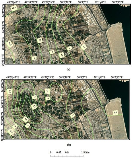 In the study area, the shallow aquifer is the Neogene aquifer, and the deep aquifers are the Alat and Al-Khobar aquifers. Potentiometric maps of GW levels were established for the shallow and deep aquifers, as shown in Figure 6. Figure 6a illustrates the shallow aquifer’s water level, with the water level decreasing to the east, northeast, and southeast toward the Arabian Gulf. The deep aquifer’s water level also decreases toward the Arabian Gulf with upconing of GW levels in the middle of the study area, as shown in Figure 6b. The raising of the water level is due to the reduction of GW pumping from the deep aquifer in the middle part of Al-Qatif as it is replaced by treated wastewater for irrigation.