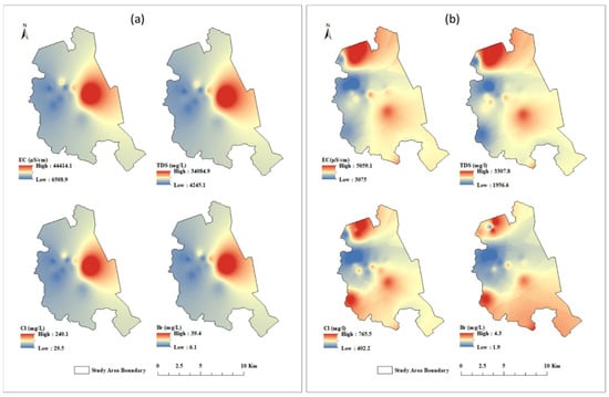 Spatial distribution maps of EC, TDS, Cl−, and Br− for (a) shallow GW and (b) deep GW.