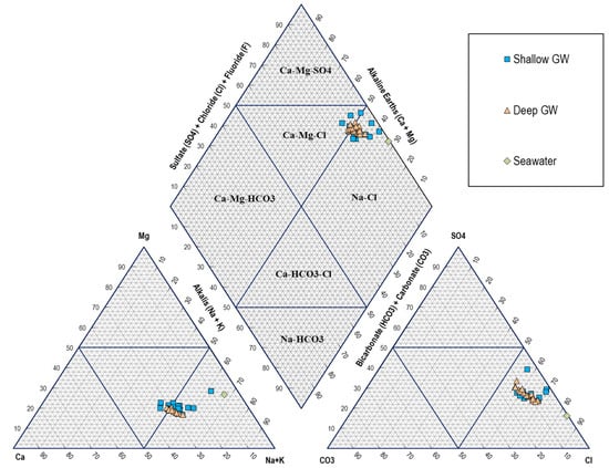 Piper (1944) [43] proposed a diagram illustrating water-dominant hydrochemical facies. After that, Piper diagrams have been used to define the main hydrochemical facies of GW for SWI assessment studies (e.g., [5,44,45]). A Piper diagram for the tested GW samples and seawater reference sample was established, as shown in Figure 8. The Piper diagram of Figure 8 shows that the GW from both the shallow and deep aquifers in the Al-Qatif area is mainly of Na-Cl type followed by Ca-Mg-Cl type. GW samples mostly plot within the Na-Cl domain in the diamond part of the Piper plot, revealing an interaction between GW and seawater in both aquifers. Some GW samples plotted close to the reference seawater sample reflect a high rate of SWI in the study area.