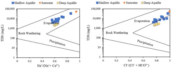 Gibbs (1970) [46] proposed a diagram, named the Gibbs diagram, which illustrates the relationship between TDS vs. Na+/(Na+ + Ca2+) and Cl−/(Cl− + HCO3−) in order to identify the processes that control GW chemistry, including precipitation, evaporation, rock–water interaction, and seawater intrusion. Scholars have adopted the Gibbs diagram to define the states of mixing of GW with seawater in coastal aquifers (e.g., [47]). The GW samples from shallow and deep coastal aquifers in the study area and seawater reference sample from the Arabian Gulf were plotted in the Gibbs diagram, as shown in Figure 9. All GW samples from both aquifers plotted in the evaporation domain with more extent toward the seawater reference sample, indicating an interaction between GW and seawater. Moreover, GW samples from a shallow aquifer located closer to the seawater reference sample reveal more influence of seawater on the shallow GW aquifer than the deep aquifer.