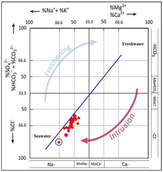 Hydrochemical Facies Evolution Diagram (HFE) of the tested GW samples. Seawater sample indicated with a red circle.