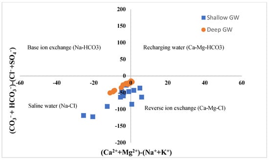 Chadha (1999) [51] proposed a diagram illustrating the difference between alkaline earth (Ca2+ + Mg2+) and alkali metals (Na+ + K+) vs. the difference between weak acidic anions (CO3− + HCO3−) and strong acidic anions (Cl− + SO4−). The diagram has been applied in the literature to identify hydrochemical processes that control the GW chemistry in coastal aquifers, as an approach to identify SWI and GW salinization (e.g., [52,53,54]). Figure 11 shows the Chadha diagram of the tested GW samples from both aquifers. About 70% of the shallow GW samples and 100% of the deep GW samples are located within the left bottom quadrangle with the saline water type, indicating seawater intrusion as the main hydrochemical process controlling the GW salinization in the studied coastal region. On the contrary, 30% of the studied GW samples from the shallow aquifer were located in the right bottom quadrangle of the diagram, showing more mixed Ca and Mg-Cl types of water, revealing a reverse ion exchange process.