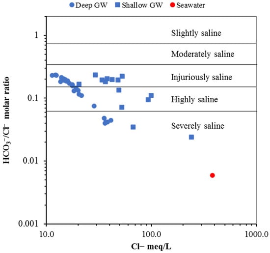 The influence of saline water on GW in the coastal aquifer in the study area was evaluated by applying the inverse Simpson’s ratio [55,56]. This ratio classifies GW into six classes: severely saline, highly saline, injuriously saline, moderately saline, slightly saline, and freshwater. Molar ratio of HCO3−/Cl− with a value higher than 2 reveals freshwater recharge, while the degree of salinization is reflected by a ratio of less than 2 [57,58,59]. As shown in Figure 12, the GW samples from shallow and deep aquifers fall into severely saline, highly saline, and injuriously saline classes. Totals of 14%, 28%, and 58% of shallow GW samples plotted within the severely saline, highly saline, and injuriously saline classes, respectively. GW samples from deep aquifers fall into severe, high, and injuriously saline classes with 15%, 20%, and 65%, respectively. The results, as shown in Figure 12, clearly show that the GW of both aquifers has been influenced by seawater, with higher salinization on shallow GW and wells located close to the shoreline.