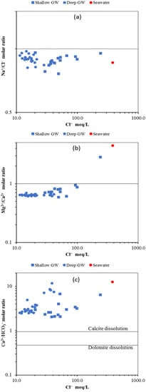The relationship between Ca2+/HCO3− vs. Cl− has been used to evaluate the impact of carbonate mineral dissolution on GW chemistry in coastal aquifers [58,59]. As shown in Figure 13c, GW samples from both aquifers plot above the calcite dissolution line, indicating excess of Ca2+, and this is mainly related to reverse ion exchange via seawater intrusion. The Ca2+/HCO3− ratio of GW samples from both aquifers ranges from 2–11, with some samples close to the seawater reference sample.