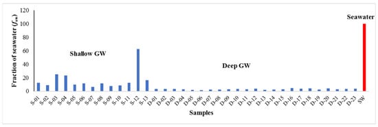 Diagram shows fraction of seawater for GW samples from shallow and deep coastal aquifers with seawater sample reference.