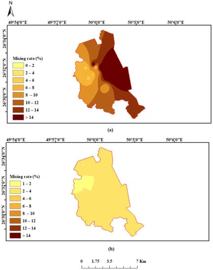 where CCl,sam, CCl,sw, CCl,f refer to the concentration of chloride ions in GW samples, seawater, and freshwater, respectively. The fraction of seawater (fsw) of tested GW samples from shallow and deep aquifers in the study area is illustrated in Figure 14. The fractions of seawater for GW samples from the shallow aquifer range from 6.51% to 62.38%, with an average value of 16.69%. The deep GW samples have seawater fractions ranging from 1.73% to 4.45% and an average value of 3.02%. The highest value of mixing proportion of seawater was observed in a well tapped with the shallow aquifer that is present close to the shoreline of the Arabian Gulf (1.6 km from the sea). The lowest value of seawater fraction was observed in the shallow GW well located 4.3 km from the sea. In general, shallow GW in the study area displays a higher fraction of seawater than the deep GW, indicating a significant contribution of seawater to GW chemistry and salinity of shallow wells. The spatial distribution of fsw for both aquifers has been mapped, as shown in Figure 15. Higher values of fsw of shallow GW occurred along the coast, indicating the advancement of seawater into the shallow aquifer with an average width of around 3.5 km. On the contrary, most of the study area has a range of fsw for deep GW from 2–4%. Salinity contamination of the shallow GW in the study area is most likely triggered by the decline of the water table due to decades of overexploitation of shallow aquifers and persistently low precipitation in the region.