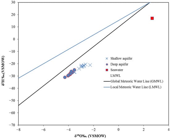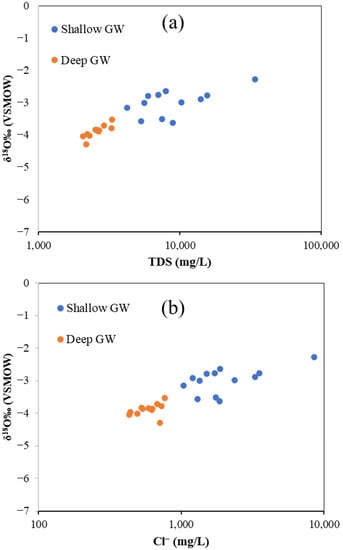 Oxygen isotope data were correlated with hydrochemical parameters, including salinity (TDS) and Cl− concentration, to understand the impact of SWI on the isotope composition of GW in the study area. As illustrated in Figure 17, the δ18O had increased values associated with increasing TDS and Cl− concentration for both shallow and deep GW. However, shallow GW samples show the higher δ18O values associated with a higher concentration of TDS and Cl−, indicating more influence of seawater on the shallow aquifer in the study area. The result of the current study is in line with similar results found by [62].