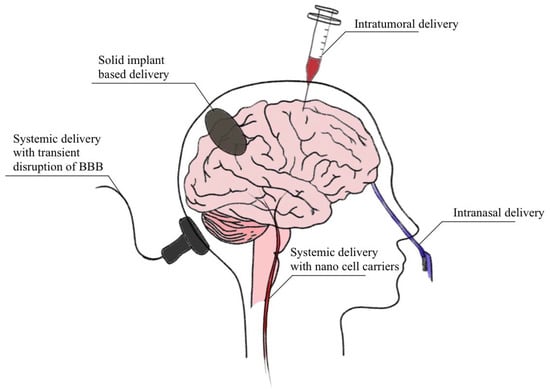Current brain drug delivery techniques that have been clinically used are not always satisfactory. The brain is not an easily accessible anatomical site. Therefore, the objective of this review is to provide a broad overview of current strategies for brain drug delivery techniques from the past few years [7]. In conventional daily delivery, brain drugs are initially taken either orally or by injection into a vein, the subcutaneous space, or the muscle. Usually, the drug is then absorbed into local blood microcirculation or the injected site. In the next step the drug molecules enter the systemic blood circulation and are subsequently transported to various organs throughout the body. The drug molecules then pass from microcirculation to the cells and interstitial space at the brain tissue location [8]. The ideal and successful brain drug delivery should be efficient, safe, convenient to use, noninvasive and localized within a specific region. Intravenous brain drug delivery via the vascular route has obvious advantages but requires efficient drug transport across the blood–brain barrier (BBB) [9]. One of the promising solutions seems to be the ultrasound technique. Ultrasound-facilitated brain drug delivery has shown the potential to deliver drugs across the blood–brain barrier into targeted sites within the brain noninvasively [10]. Figure 1 below presents the main rounds of brain drug delivery, thus including intratumorally delivery, solid implant-based delivery, systematic delivery with transient disruption of BBB with nanotargeted carriers and intranasal or oral delivery [9,10].