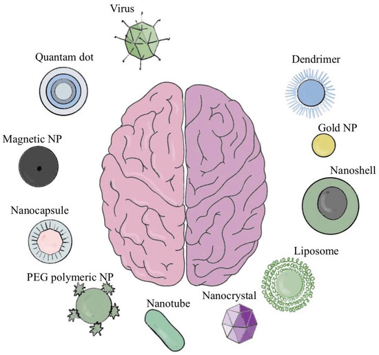 The usage of magnetic nanoparticles (MNPs) as transducers in advanced neuromodulation is promising in the field of cancer therapy. It has recently been introduced as a method for remote and wireless neuromodulation [14]. Gold nanoparticles with a core size of 2 nm covalently coated with glycans to maintain solubility, targeting molecules for brain endothelium, and cargo molecules hold great potential for delivery of therapies into the CNS [15,16]. It is estimated that the microvascular aperture of the glioma ranges from 7 to 100 nm, which is significantly smaller than peripheral tumors (380–780 nm). Therefore, small-sized molecules such as dendrimers may penetrate deeper and may obtain a more extensive tissue distribution in brain tumors than conventionally sized (approximately 100 nm) nanoparticles [17].
