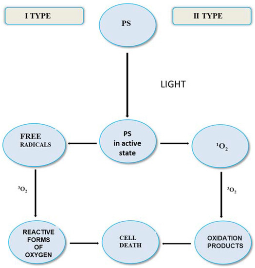 The current development of molecular diagnostics in medicine has significantly helped to understand the biochemistry of neoplasms [20,21]. This paper is specifically related to the advances in PDT with regard to the treatment of CNS neoplasm. PDT is a cancer treatment that uses light, a PS dye molecule and oxygen to destroy tumors. Traditionally, PDT uses intravenously injected photosensitizers to generate singlet oxygen (1O2) for the treatment of tumors. 1O2 is a critical intermediate in PDT. 1O2 can react and destroy almost any biological tissue it contacts. Figure 3 shows the course of the PDT reaction. The photodynamic reaction (RFD) is a several-step procedure. The first indispensable factor involved in it is PS. A photosensitizer is a substance that accumulates in the neoplastic tissue and selectively sensitizes it to light. Another factor is the light source with commensurate wavelength, which intensifies the PS accumulated in the tumor area. In turn, the last necessary stimulus is oxygen distributed throughout the tissue [22]. The energy obtained from the light wave is transferred to molecular oxygen and then produces ROF. The origin of RFD is the correlation between the emission bandwidth of the light source and the dye absorption bandwidth. PDT only covers tissue sites that have been treated [23,24,25]. Photosensitizers are transmitted to the human body either directly or as a result of injection [26]. The course of tumor cell degradation as a result of PDT depends on the oxygen concentration in the reaction environment. It can succumb according to two types of mechanisms. The type I reaction occurs when the susceptible PS damages cell membranes and organelles. This type of reaction is caused by free radicals that generate oxidized products. The photosensitizer can create a much more reactive form of oxygen in the triplet state (type II reaction) [27,28,29,30], therefore it is assumed that the type II mechanism is overbearing and determines the effectiveness of the therapy [31]. Both mechanisms take place at the same time, and the ratio of their share is influenced, among other factors, by the concentration of the substrate and oxygen, the pH of the environment or the dye composition [32]. It should be mentioned that only the cells that undergo PDT are closely adjacent to the site of production of the reactive oxygen species [33,34]. The effectiveness of PDT as well as its cytotoxicity is influenced by many factors, including the type of PS, the introduced dose of photosensitizer and light, as well as the presence of oxygen and the time between the introduction of PS and exposure to light [35,36].
