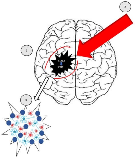 - Stepp, H.; Stummer, W. 5-ALA in the management of malignant glioma. Lasers Surg. Med. 2018, 50, 399–419. [Google Scholar] [CrossRef]
