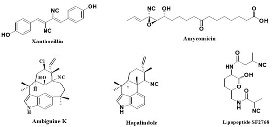 Examples of natural products bearing one or two isocyano functional groups.