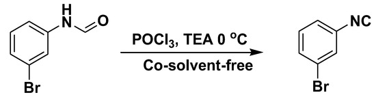 The dehydration of N-(3-bromophenyl)formamide with phosphorus oxychloride, in the presence of triethylamine under co-solvent-free conditions at 0 °C produced 3-bromo-1-isocyanobenzene in excellent yield (Figure 2). The starting point for our experiments was to optimize the reaction conditions, such as solvent and reaction time, for the synthesis of isocyanides with wide structural diversity.