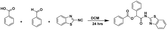 The remaining isocyanides, despite being stable enough to be isolated, decompose rapidly at room temperature and cannot be preserved for any length of time. Isolation of heterocycle-containing isocyanides was complicated by their intrinsic instability. To verify that the herein-obtained isocyanides can be used as in situ reactant in a 3-component Passerini reaction, we chose to proceed with the synthesis of MCR-derived compounds utilizing benzoic acid, benzaldehyde, and 2-isocyanobenzothiazole as in situ reactants in a classical Passerini 3-components reaction (Figure 3). Overall, the findings showed that minor impurities in the isocyanide have no significant impact on the subsequent transformation, suggesting that this approach could be used in other multi-component processes. It is worth noting that these compounds have the potential to undergo the full range of multicomponent reactions for which isocyanides are known, exemplified in, for example Passerini and Ugi reactions, and they have the desirable structural diversity and molecular complexity needed for fine-tuning biological activity.