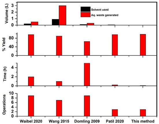 In order to highlight the superiority of our approach, we calculated the environmental factor (E-factor) and compared it to reported literature protocols for different dehydration reagents including p-toluenesulfonyl chloride (p-TsCl), phosphoryl trichloride (POCl3), and the combination of triphenylphosphane (PPh3) and iodine, bearing in mind that the lower the E-factor, the better the process’ overall performance. The excessive usage of organic solvent for the dehydration process and aqueous workups adopted during the purification step leads to generation of more aqueous waste for other approaches, thus resulting in a high E-factor (Table 5).