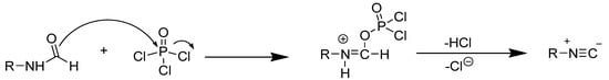 Many other reagents, including phosgene [20], diphosgene (trichloromethyl carbonochloridate) [21], organic chlorophosphate derivatives [22], XtalFluor-E [23], tosyl chloride [24], and phosphoryl chloride [19,25] have been employed as dehydrating reagents in combination with bases, most commonly tertiary amines, to avoid reduced yields of the products. However, all advances have one or more flaws, such as lengthy, tedious operations, exotic and expensive reagents, enormous waste generation, and prolonged exposure of the chemist to potentially toxic gases, and they frequently have a limited functionalization scope [15,25,26,27]. Despite the fact that phosgene and diphosgene have the highest yields, their use is confined to laboratory-sized work due to their extreme toxicity and difficult handling in the case of phosgene, and their expensive cost in the case of diphosgene [24]. As a result, the phosphoryl chloride approach was utilized in order to achieve yields comparable to phosgene, di-phosgene, and tri-phosgene. The most often used dehydrating agent, phosphorus oxychloride (POCl3), creates inorganic phosphate as a by-product, making it preferable to p-TsCl, which produces more organic waste [24]. Depending on the reactivity of the formamide, the most typical POCl3 method is carried out at low temperatures up to −50 °C. To avoid isocyanide hydrolysis, the workup entails cautious hydrolysis to eliminate any excess dehydrating agent while keeping the pH in the basic range. Finally, distillation, chromatography, or recrystallization must be used to purify the crude isocyanide [19]. Due to the presence of small amounts of acidic materials, this step can also cause significant yield losses. As a result, the traditional POCl3-enabled isocyanide synthesis not only necessitates meticulous reaction, workup, and purification conditions, but it is also time-consuming and exposes the chemist to the often smelly isocyanide vapours for an extended period of time.