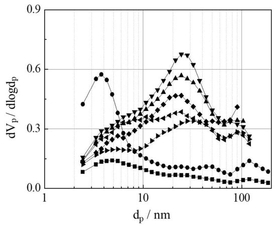 Pore distributions of MYZ-t and YZ samples. YZ (■), MYZ-t (t = 0 (●), 0.5 (▲), 1.0 (▼), 5.0 (◆), 16 (◄), and 24 (►)).