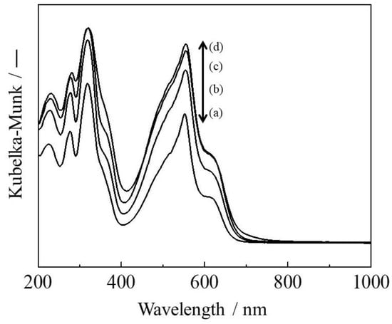 Figure 5 presents the UV-vis diffuse reflectance spectra of the Fe(X)L-MYZ-1.0 catalysts. The catalysts showed no absorption in the ultraviolet to the visible region without the metal complex, Fe-YZ and YZ [33]. The absorption spectra of Fe(X)L-MYZ-1.0, Fe(X)L-YZ, and FeL-MYZ-t catalysts (Figure 5) produced two bands in the regions of 400–650 nm and 250–400 nm, which can be assigned to metal-to-ligand (d–π*) charge-transfer (MLCT) and a π–π* transition of terpy ligand of the [Fe(terpy)2]2+ complex, respectively, similar to that of [Fe(terpy)2](ClO4)2 [33]. The UV-vis spectral behaviors of Fe(X)L-YZ (Figure S6) and FeL-MYZ-t (Figure S7) catalysts were quite similar to those of Fe(X)L-MYZ-1.0 catalysts (Figure 5). The intensity of MLCT at 550 nm increased with increasing Fe content in the Fe(X)L-MYZ-1.0 and Fe(X)L-YZ catalysts (Figure 5 and Figure S6). These results suggest that the UV-vis spectral behavior of Fe complexes in zeolites is not affected by the presence or absence of mesopore. Elemental analysis, XRD, and UV-vis showed that the desired Fe complexes, [Fe(terpy)2]2+ were formed in the supercage of Y-type zeolite.