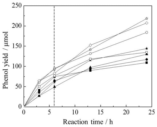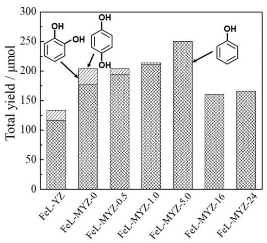 The partial oxidation of benzene with H2O2 using the FeL-MYZ-t and FeL-YZ catalysts with the same Fe content (0.9–1.2 wt. %) in Table S1 proceeded. Phenol was produced as the main product, while o-catechol and traces of hydroquinone were produced as by-products (Figure 9). The catalytic activities of the FeL-MYZ-t catalysts were higher than those of the FeL-YZ catalyst. The catalytic activity of FeL-MYZ-t increased to t = 5.0 and decreased with further increases in t. The phenol selectivity of FeL-MYZ-t increased with increasing t. These results suggest that the catalytic activity of FeL-MYZ-t and phenol selectivity increased with the increasing mesopore size of the zeolite support (average pore diameter (dp), mesopore volume (Vmeso), and surface area (Smeso) in Table 1 and pore distribution in Figure 2), supporting the hypothesis shown in Figure 8. The FeL-MYZ-5.0 catalyst exhibited the best catalytic activity for the oxidation of benzene, with H2O2 to phenol among the catalysts tested.