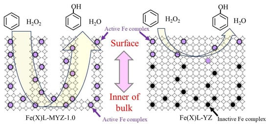 Schematic image of Fe(X)L-MYZ-1.0 and Fe(X)L-YZ catalysts for oxidation of benzene with H2O2 to phenol.