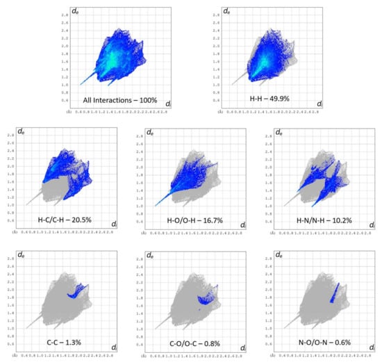 Hirshfeld surfaces are a critical tool that can assist in the understanding of a variety of properties, such as the electrostatic potential, shape index or the dnorm of a crystal system [,,]. Through the evaluation of such properties, information may be ascertained with regard to the type and quantity of interactions present for an API. Such data can then be utilized to engineer additional systems involving the targeted API [].