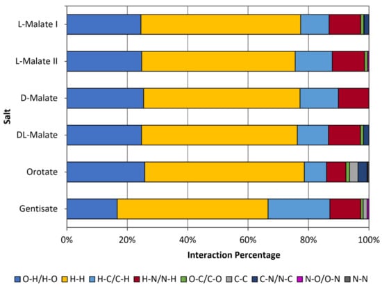 Interaction types and percentages for the nicotinium gentisate salt described herein in comparison to the orotate hemihydrate salt and the family of malate salts that have previously been synthesized.
