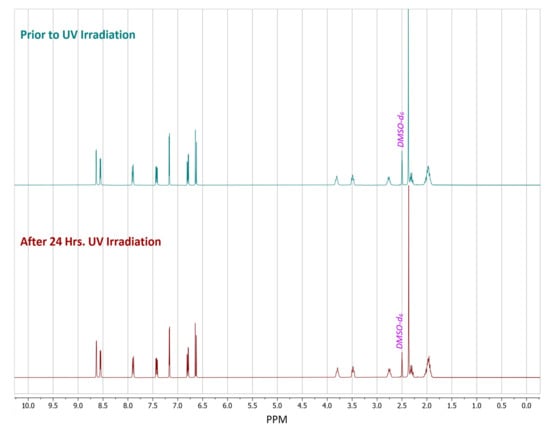 NMR analysis was performed on a sample of the salt former orotic acid, (S)-nicotine, and the synthesized (S)-nicotinium orotate hemihydrate salt. Each sample was then irradiated with ultraviolet (UV) light in a home-built vented box with air flow for 24 h using four Southern New England Ultraviolet Company RPR—3000A (Branford, CT, USA) UV bulbs (λ = 300 nm). NMR analysis was then carried out on each sample to screen for any UV photodegradation of products.