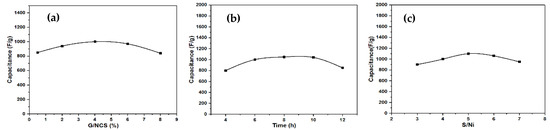 Specific capacitance of NCS@G/Ni composite electrodes at various (a) G/NCS, (b) times, and (c) S/Ni.