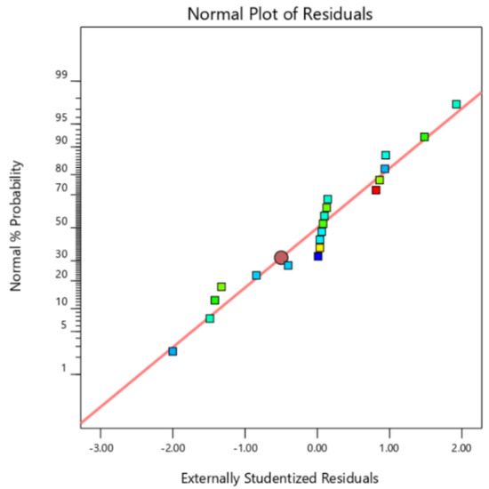Figure 2 shows the plots of residuals against the normal probability for specific capacitance. As shown in the plot, the obtained data show a linear relationship, which indicates the distributed normal distribution of the residuals. Thus, it is concluded that the prediction of the experimental results obtained from the developed quadratic model is satisfactory in the parameterization of the specific capacitance.