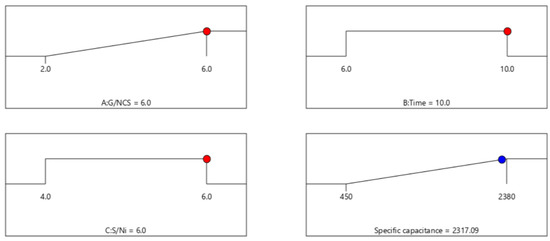 Numerical optimization was executed using the desirability function of Design Expert Software; the goal was to find the maximum specific capacitance within the independent variables of G/NCS, hydrothermal time, and S/Ni. The solution with maximum specific capacitance was selected as the optimized preparation of the NCS@G/Ni composite electrode condition. The two-dimensional (2D) plots in Figure 3 represented Equation (1) and were used to predict the specific capacitance for various values of independent variables. The maximum specific capacitance is 2317 F g−1 at G/NCS = 6.0%, hydrothermal time = 10.0, and S/Ni = 6.0.