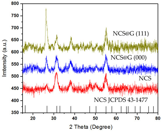 XRD pattern of NCS, NCS@G (000), and NCS@G (111).