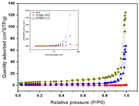 Nitrogen adsorption–desorption isotherm curves and pore size distribution of NCS, NCS@G (000), and NCS@G (111).