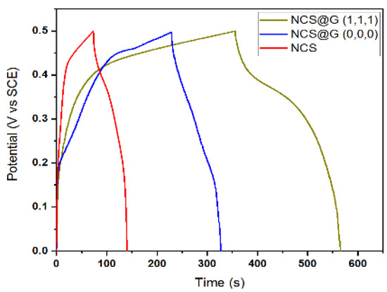 GCD curves of NCS, NCS@G (000), and NCS@G (111) electrodes at the current density of 5 A g−1.