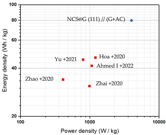 Ragone plots of the NCS@G (111)//(G + AC) supercapattery cell compared with other reported NCS-based supercapacitors. Yu: NiCo2S4//G@CNT (45 Wh kg−1 at 800 W kg−1) [11]; Ahmed I: NiCo2S4@rGO//AC (42 Wh kg−1 at 1067 W kg−1) [20]; Zhai: NiCo2S4@EEG//NMCS (30 Wh kg−1 at 800 W kg−1) [21]; Zhao: NiCo2S4@rGO//N g (34 Wh kg−1 at 411 W kg−1) [22]; Hoa: NiCo2S4@rGO//rGO (47 Wh kg−1 at 1200 W kg−1) [23].