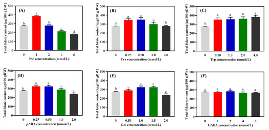 The content of total folates in wheat seedlings with different treatments (n = 3). Phe (A), Tyr (B), Trp (C), pABA (D), Glu (E), and GABA (F) were seedlings treated with phenylalanine, tyrosine, tryptophan, p-aminobenzoic acid, γ-aminobutyric acid, and glutamate, respectively. a–d represent significant differences among different treatment concentrations (p < 0.05).