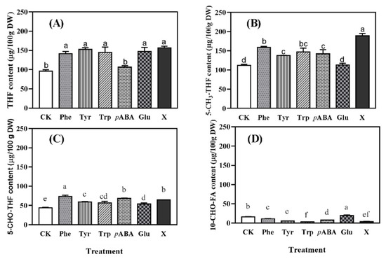 Contents of tetrahydrofolate (A: THF), 5-methyltetrahydrofolate (B: 5-CH3-THF), 5-formyltetrahydrofolate (C: 5-CHO-THF), and 10-formylfolic acid (D: 10-CHO-FA) in wheat seedlings. CK was the wheat seedlings cultured with distilled water; Phe, Tyr, Trp, pABA, and Glu were seedlings cultured with 1.00 mM phenylalanine, 0.25 mM tyrosine, 0.50 mM tryptophan, 0.25 mM p-aminobenzoic acid, and 1.00 mM glutamate, respectively; X was seedlings cultured with the optimized culture solution (1.50 mM phenylalanine, 0.50 mM tyrosine, 0.50 mM tryptophan, 0.75 mM p-aminobenzoic acid, and 0.50 mM glutamate). a–f represent significant differences among treatment factors (p < 0.05).