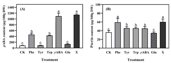 Contents of p-aminobenzoic acid (pABA); (A) and pterin (B) in wheat seedlings. CK was wheat seedlings cultured with distilled water; Phe, Tyr, Trp, pABA, and Glu were seedlings cultured with 1.00 mM phenylalanine, 0.25 mM tyrosine, 0.50 mM tryptophan, 0.25 mM p-aminobenzoic acid, and 1.00 mM glutamate, respectively; X was seedlings cultured with the optimized culture solution (1.50 mM phenylalanine, 0.50 mM tyrosine, 0.50 mM tryptophan, 0.75 mM p-aminobenzoic acid, and 0.50 mM glutamate). a–c represent significant differences among treatment factors (p < 0.05).